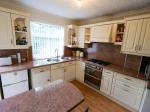 Fitted kitchen with a range of wall and base units with contrasting work surface incorporating a breakfast bar, round inset stainless steel sink unit and drainer. Double electric oven, five ring gas hob and extractor fan. Space for a fridge and dishwasher. Under stairs storage cupboard. UPVC double glazed window to the rear aspect and uPVC double doors leading to the rear garden.