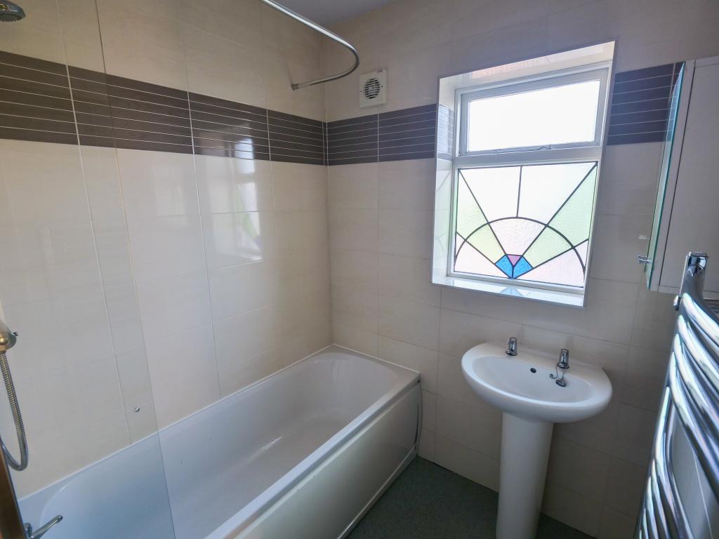 Two piece suite comprising; bath with an overhead shower and wash hand basin. Single glazed stained glass window to the side aspect. Tiled walls and heated towel rail.