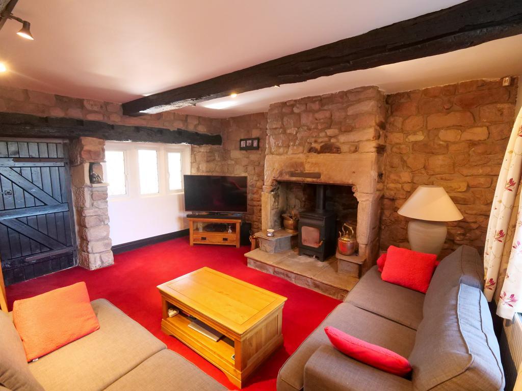 Wooden entrance doorway and uPVC double glazed window to the front aspect. Feature stone walls and log burner. Wooden beams to the ceiling. Double radiator. Stairs leading to the first floor landing. Open plan to-