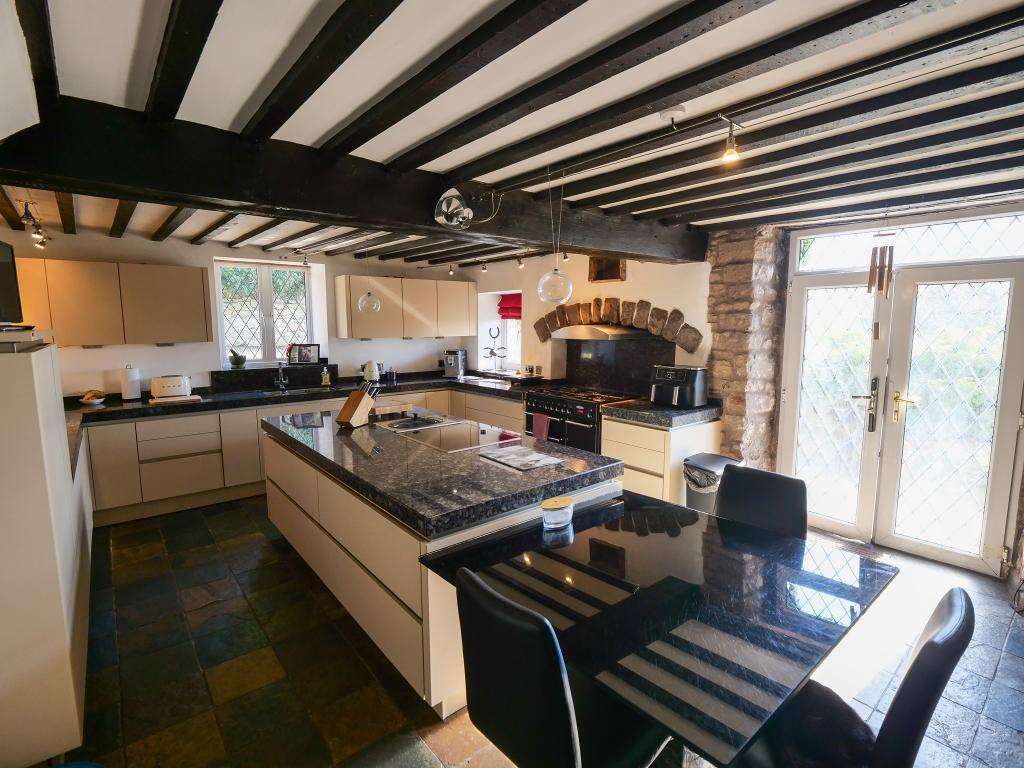 15' 7'' x 21' 7'' (4.77m x 6.59m) Fitted kitchen with a range of wall and base units, contrasting work surface, incorporating a one and a half stainless steel sink unit and three ring electric hob. Free standing Rangermaster cooker with a 5 ring gas burner and stainless steel extractor fan. Space for an American style fridge freezer. Double glazed uPVC window to the side and rear aspect. Double glazed uPVC French doors leading to the south facing rear garden. Double radiator. Wooden beams to the ceiling and tiled flooring. Door leading to-