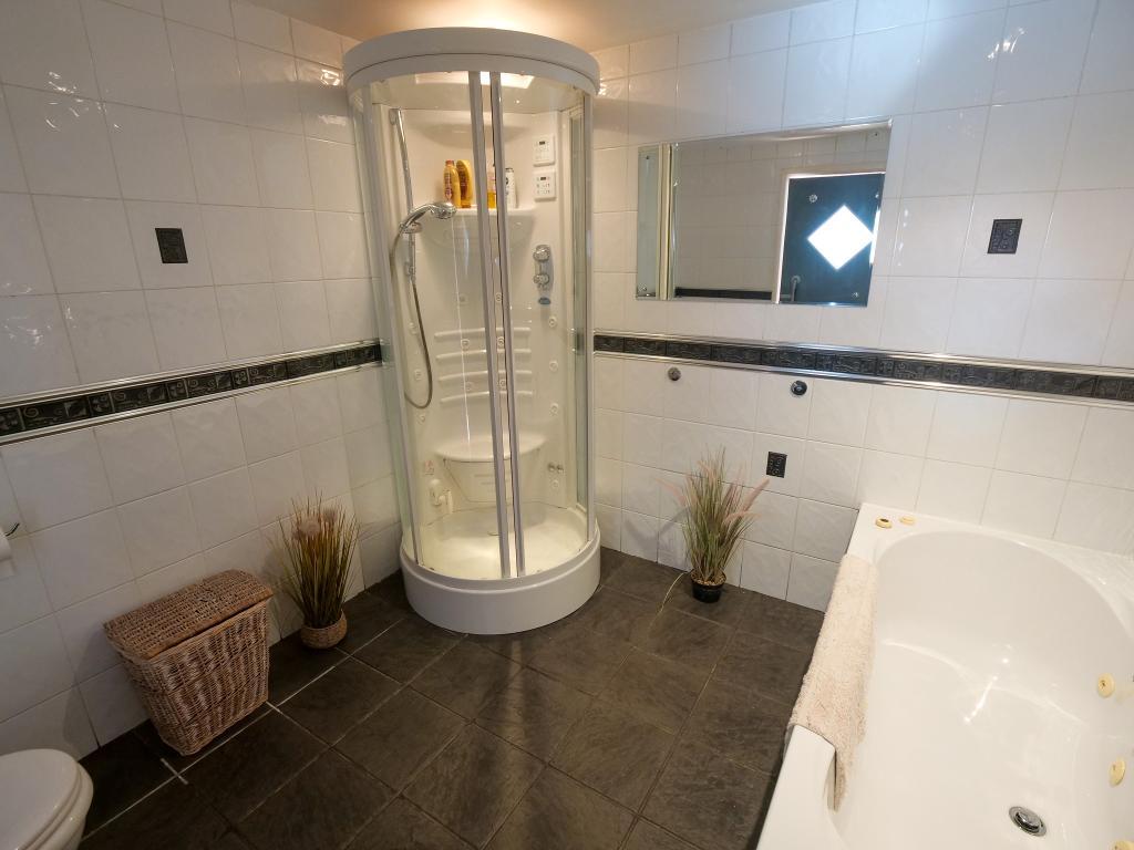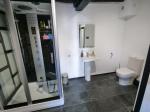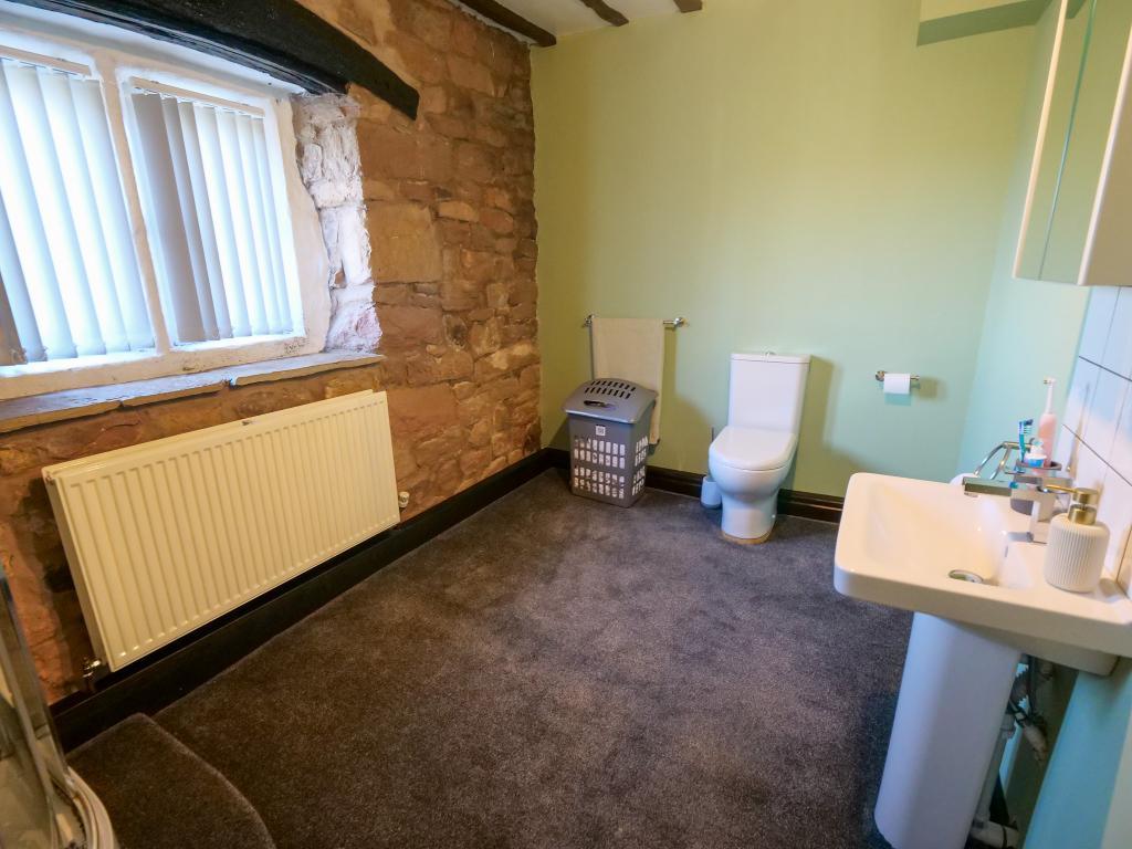 Three piece suite comprising; shower cubicle, wash hand basin and low level WC. Double radiator. Stone walls and beams to the ceiling.