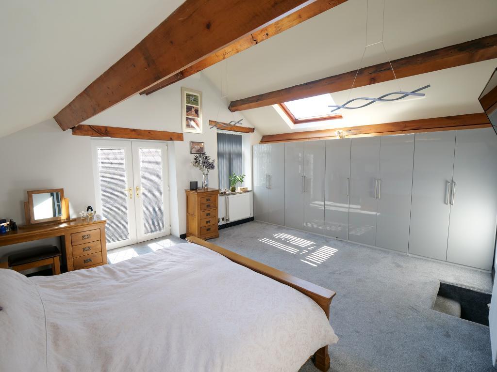 Double glazed uPVC window to the side and uPVC French doors leading to a balcony. Two Velux windows. Large fitted wardrobes. Two double radiators. Wooden beams to the ceiling. Door leading to-
