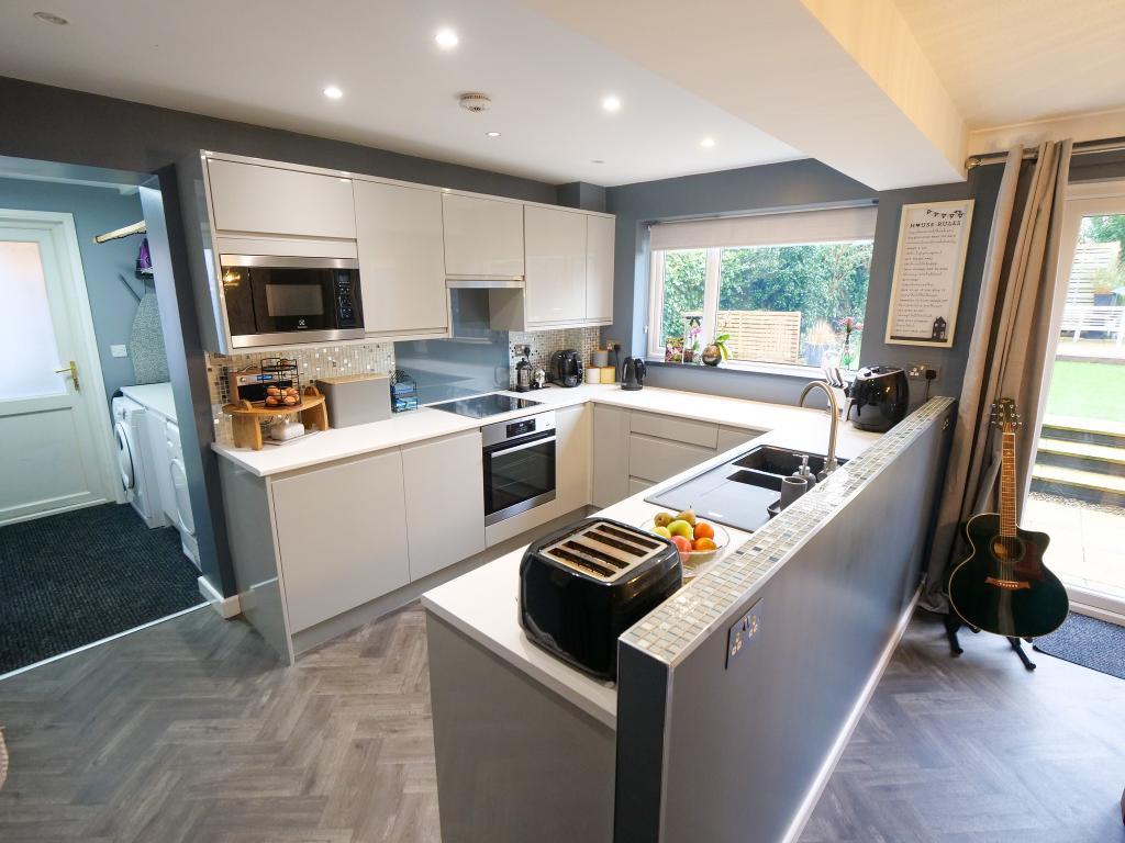 8' 4'' x 12' 2'' (2.55m x 3.72m) Modern fitted kitchen with a range of wall and base units with contrasting work surface incorporating a one and a half sink unit. Electric oven, microwave, four ring induction hob and extractor. Integrated dishwasher and space for a fridge freezer. Double glazed uPVC window to the rear aspect. Double radiator. Down lights. Open plan to-