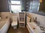 Three piece suite comprising; bath with an overhead shower, wash hand basin and low level WC. Radiator. Double glazed uPVC window to the rear aspect.