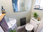 Modern two piece suite comprising; wash hand basin and low level WC. Double glazed uPVC window to the front aspect. Radiator. Vinyl flooring.