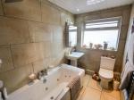 Modern three piece bathroom suite comprising; jacuzzi bath with an overhead shower, wash hand basin and a low level WC. Double glazed uPVC window to the side aspect. Heated towel rail. Tiled flooring and downlights.