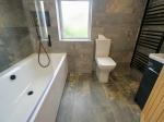 Modern three piece suite comprising; bath with overhead shower, wash hand basin and low level WC. Double glazed uPVC window to the rear aspect. Heated towel rail. Tiled walls and flooring. Downlights.