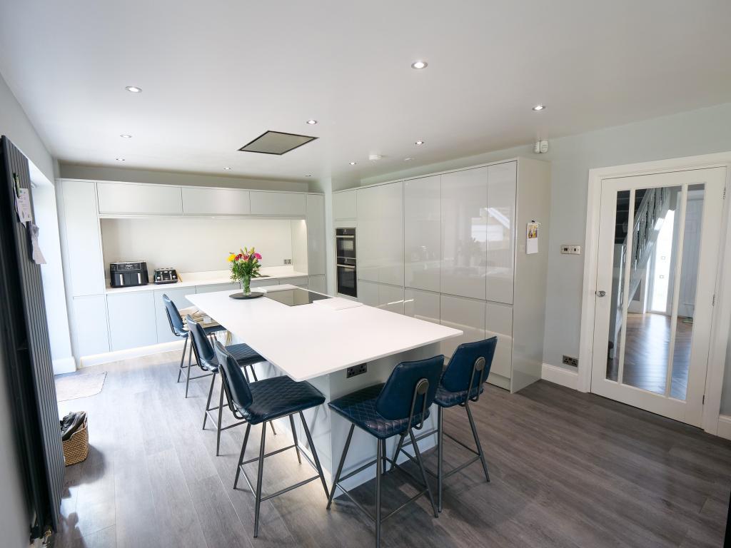 13' 2'' x 14' 6'' (4.03m x 4.42m) Modern fitted kitchen with a range of wall and base units, with contrasting work surface, breakfast bar and one and a half stainless steel sink unit. Neff electric oven, Neff Grill, Neff 6 ring induction hob and extractor fan. Integrated fridge and freezer. Designer radiator. Downlights. Double glazed uPVC patio door leading to the rear garden. Open plan to the sitting room, and access leading to the utility room.