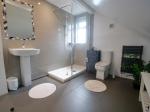 Modern three piece suite comprising; double shower cubicle, wash hand basin and low level WC. Double glazed uPVC window to the side aspect. Storage cupboard. Tiled walls and flooring. Downlights.