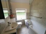 Two piece suite comprising; wash hand basin and low level WC. Double glazed uPVC window to the side and rear aspect. Downlights.