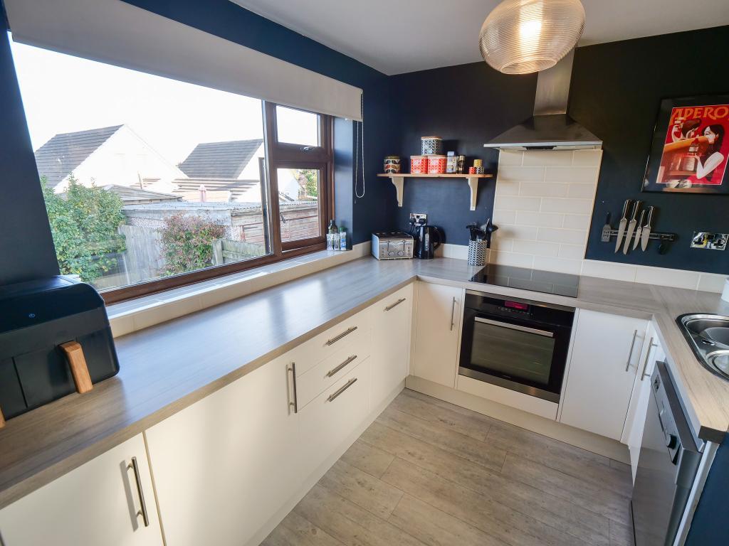 10' 5'' x 13' 2'' (3.18m x 4.02m) Modern Fitted kitchen with a range of wall and base units, contrasting work surface; incorporating a stainless steel sink unit and breakfast bar. Electric oven and four ring electric hob. Integrated dishwasher and fridge freezer. Double glazed uPVC window to the front aspect.