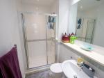 Modern three piece shower room comprising; double shower cubicle, wash hand basin and low WC. Heated towel rail. Downlights.