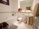 Modern three piece suite comprising; bath, wash hand basin and low level WC. Heated towel rail. Downlights.