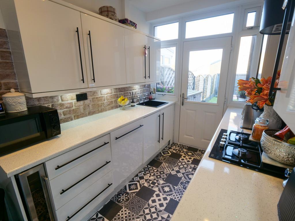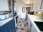 6' 10'' x 10' 7'' (2.11m x 3.25m) Fitted kitchen with a range of wall and base units comprising: four gas hob, electric oven, extractor fan, wine cooler and a sink unit. Integrated dishwasher with space for a fridge freezer. Two double glazed uPVC windows with a door to the garden. Downlights.