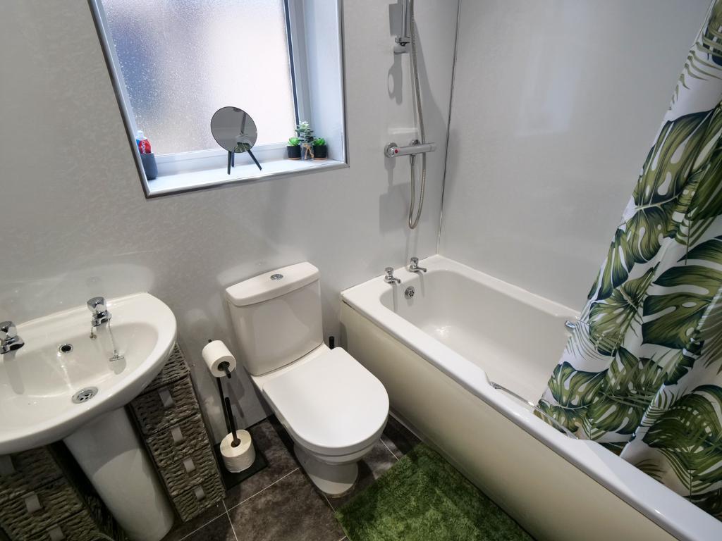 Three piece suite comprising: bath, overhead shower, wash hand basin and a low level WC. Heated towel rail. Double glazed uPVC window to the side. Downlights and decorative coving to the ceiling.