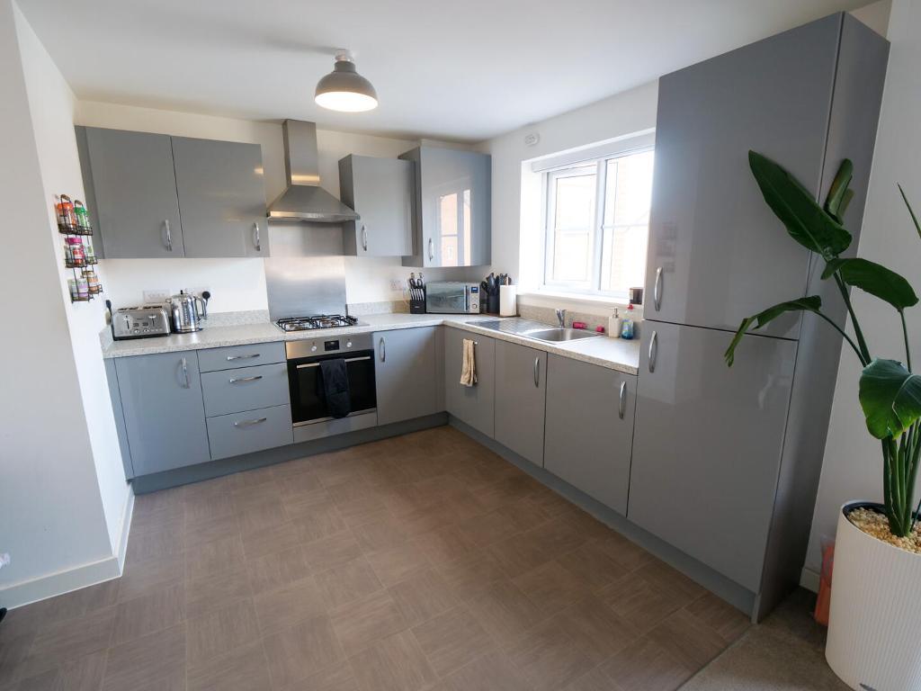 9' 10'' x 11' 3'' (3m x 3.45m) Modern fitted kitchen with a range of wall and base units comprising: stainless steel sink unit, electric oven, four gas hob and a stainless steel extractor fan. Integrated dishwasher, washing machine, fridge and freezer. Double glazed uPVC window to the front aspect. Radiator.