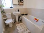 Three piece suite with a bath, wash hand basin and a low level WC. Double glazed uPVC window to the side. Radiator. Tiled walls.