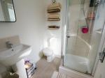 Three piece suite with a shower cubicle, wash hand basin and a low level WC. Double glazed uPVC window to the side. Radiator.