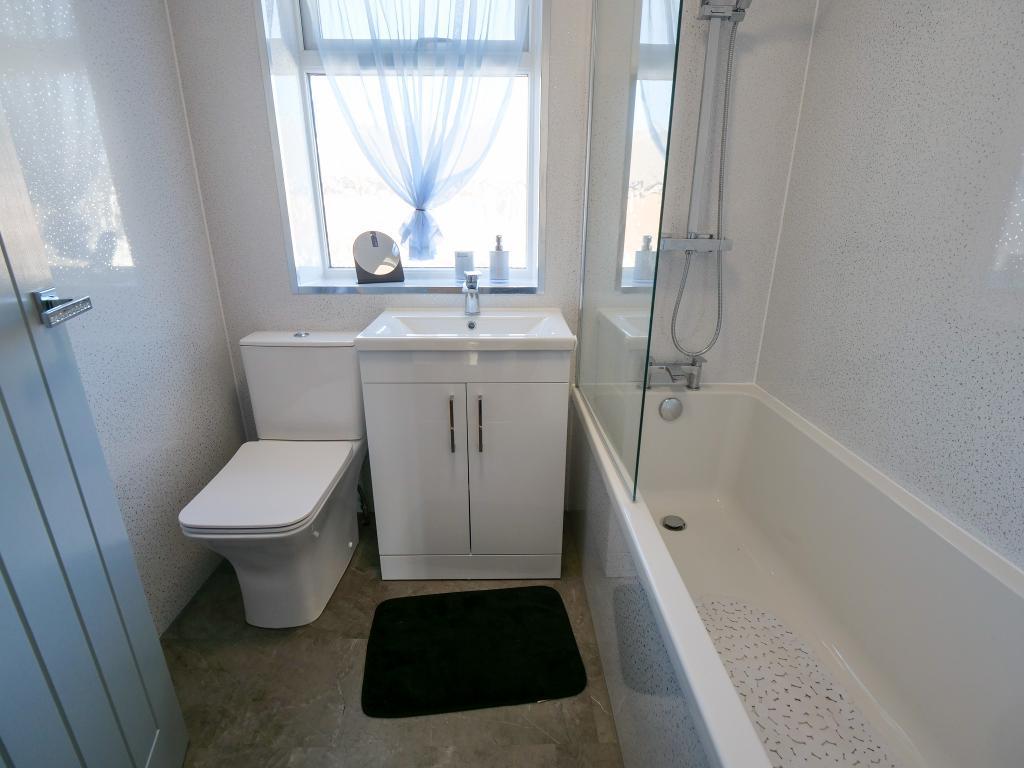 Modern three piece suite comprising: bath with an overhead shower, wash hand basin and a low level WC. Heated towel rail. Double glazed uPVC window to the front aspect.