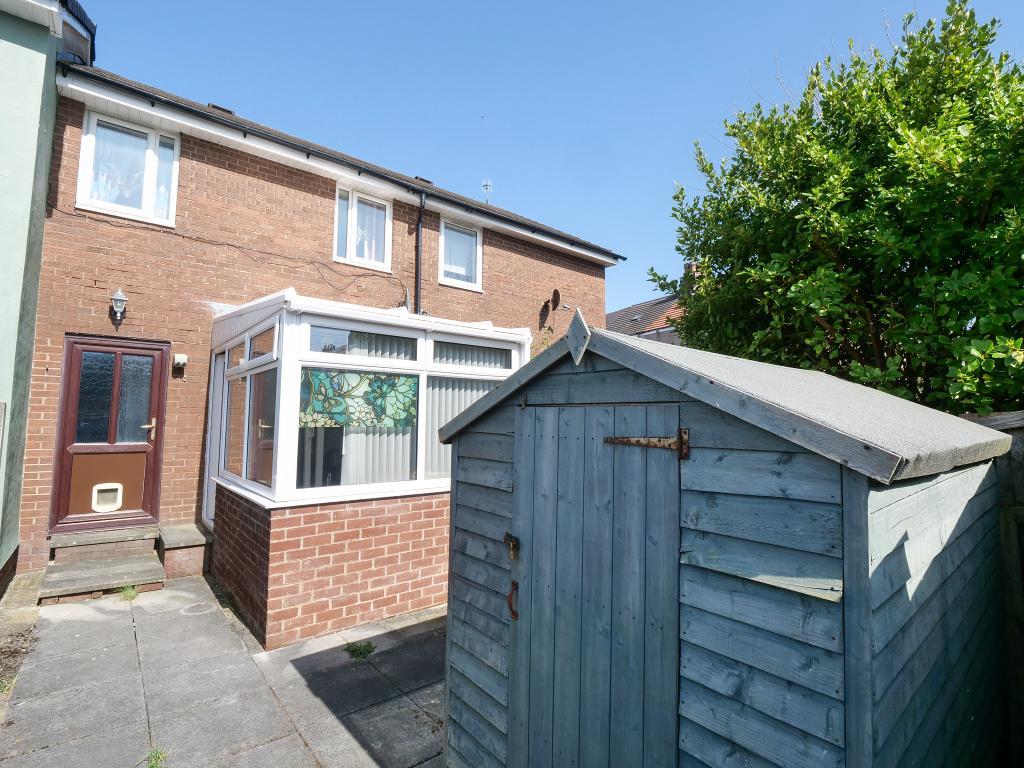 Paved rear garden with a garden shed and gated access to the rear leading to the allocated parking space.