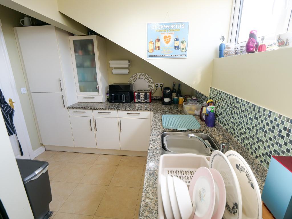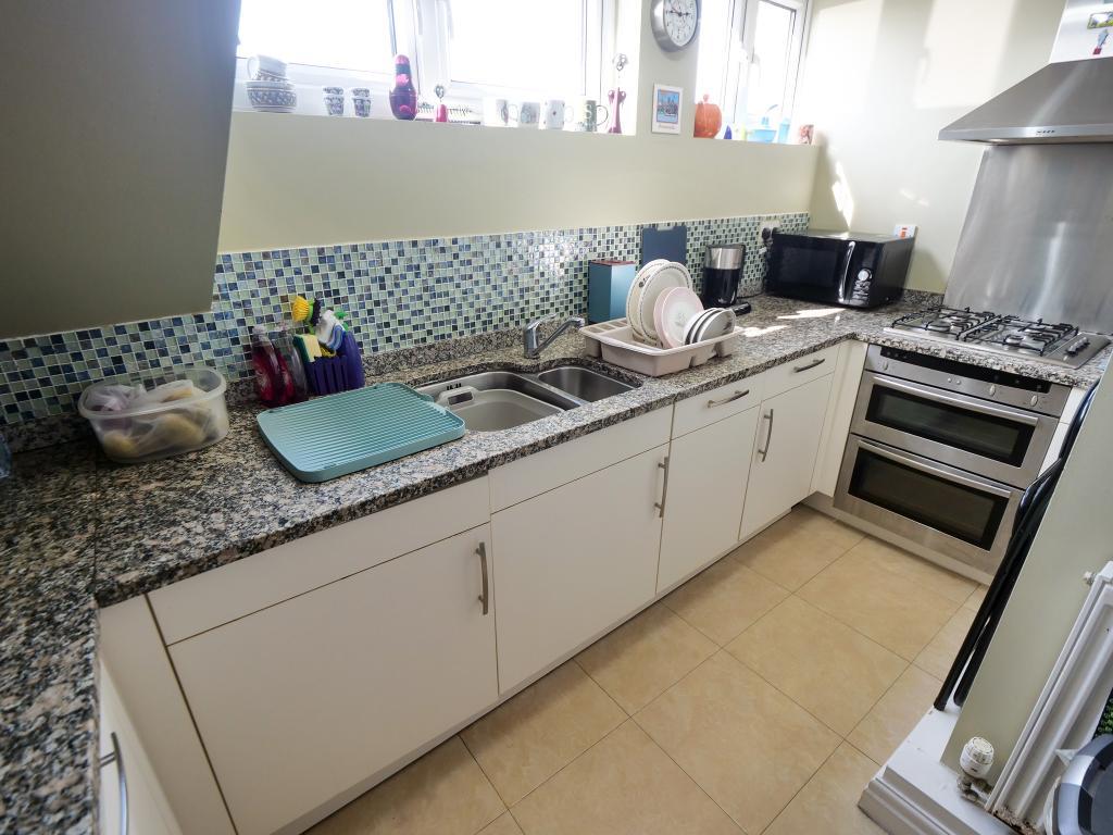 8' 11'' x 6' 7'' (2.73m x 2.01m) Fitted kitchen with a range of wall and base units comprising: one and a half stainless steel sink unit, electric oven, four gas hob and a stainless steel extractor fan. Integrated dishwasher, fridge, freezer and washing machine. Two double glazed uPVC windows to the side. Radiator.
