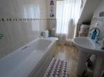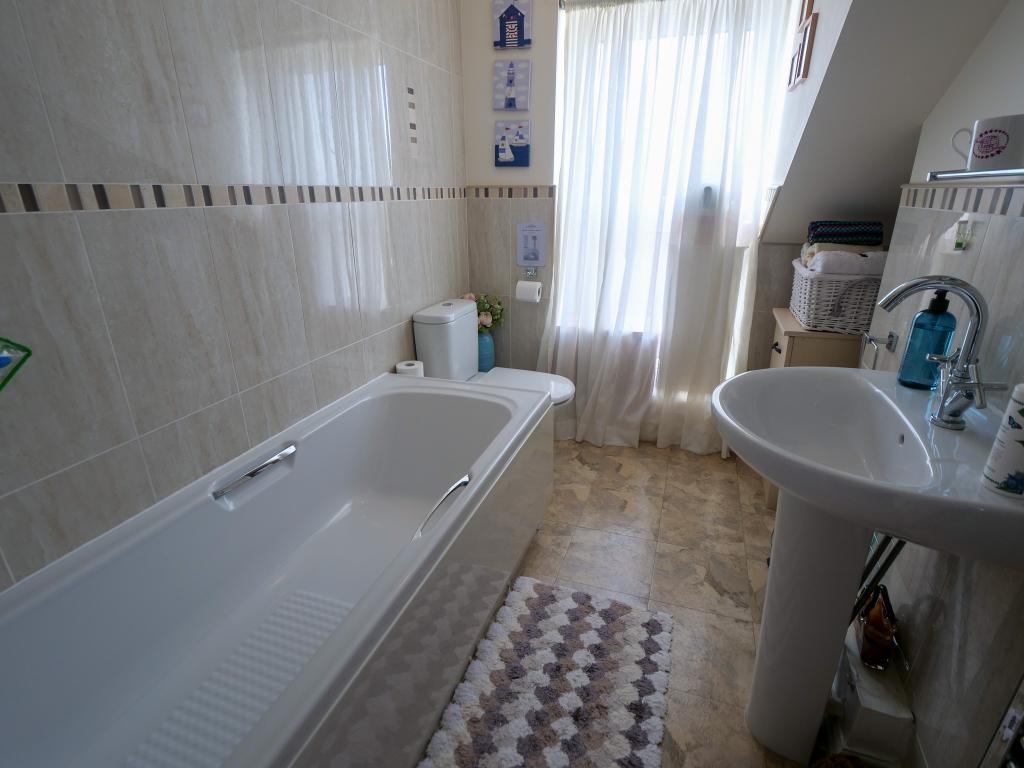 Three piece suite comprising: bath, wash hand basin and a low level WC. Heated towel rail. Double glazed uPVC window to the side. Painted and tiled walls.