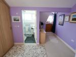 Three piece suite comprising: double shower cubicle, wash hand basin and a low level WC. Double glazed uPVC window to the side. Tiled walls. Heated towel rail.