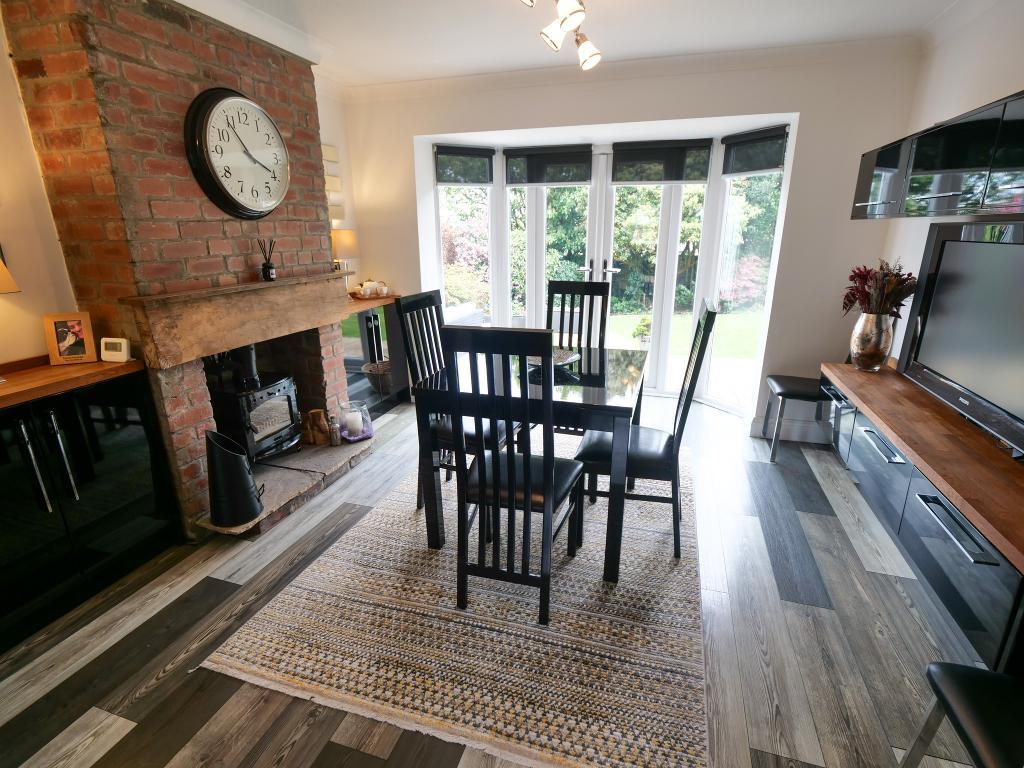12' 2'' x 11' 11'' (3.72m x 3.64m) Double glazed uPVC French doors with double glazed uPVC window to either side. Wood burner with a stone hearth and wooden mantle. Decorative coving to the ceiling. Open to -