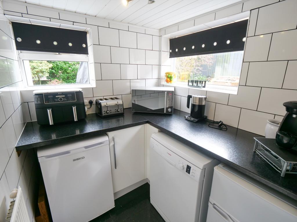 6' 7'' x 5' 6'' (2.03m x 1.7m) Double glazed uPVC window to the side and rear. Fitted base units and worktop with space for a fridge freezer and dishwasher. Cupboard with space for a washer and dryer.