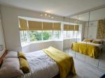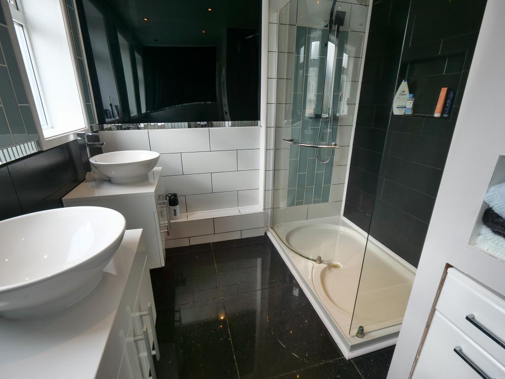 Modern four piece suite comprising: double shower cubicle, two wash hand basins and a low level WC. Three double glazed uPVC windows to the side. Tiled flooring. Downlights.