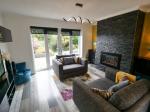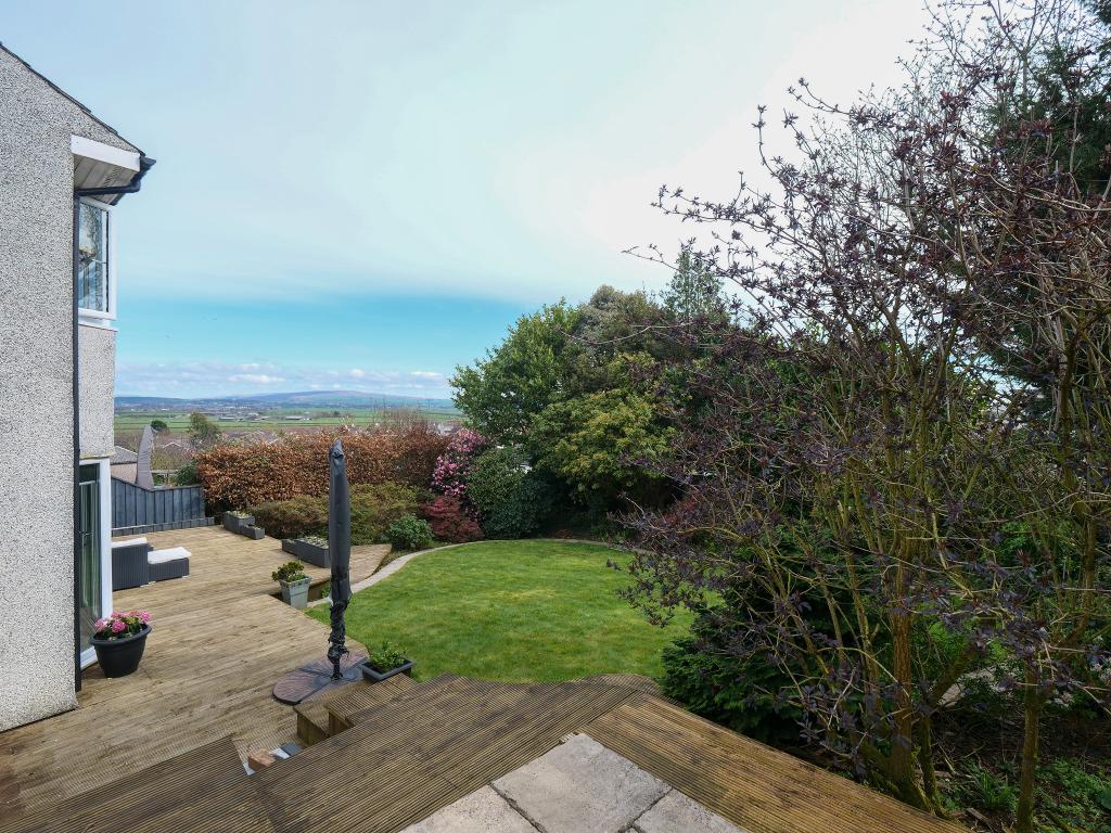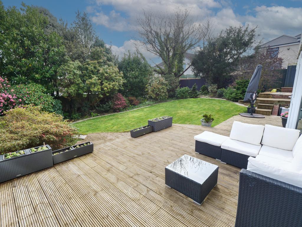 Large decking area. Laid lawn. Established shrubbery and plants. Raised patio area.